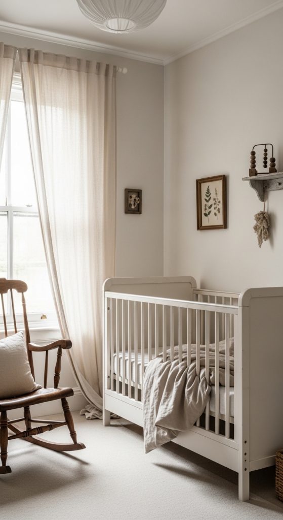 Neutral vintage nurseries create a calming environment using soft whites, creams, and beiges.