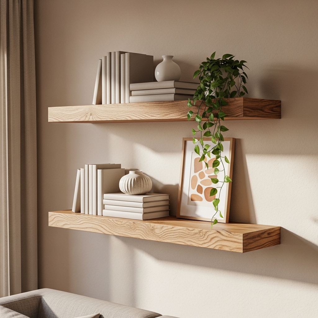 Minimal wood shelves mounted flush to the wall without visible brackets.