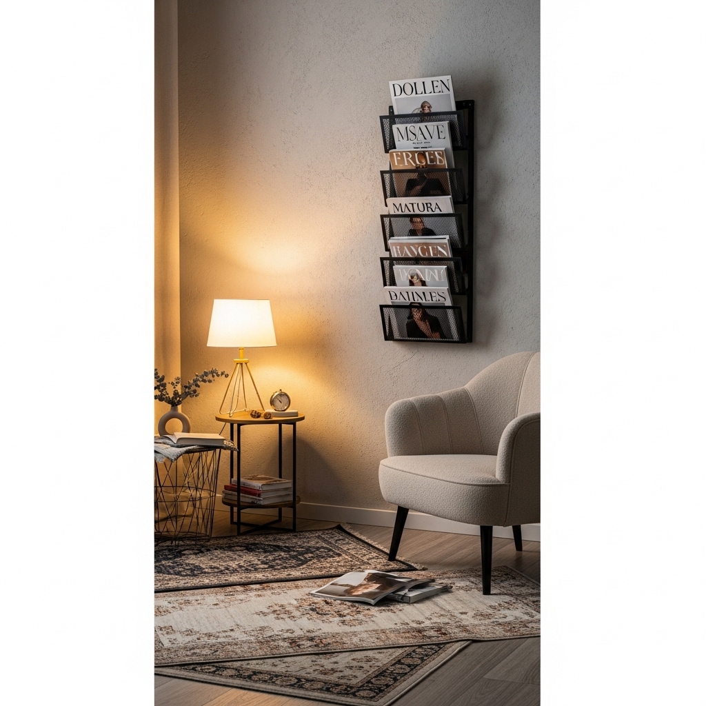 A stylish magazine holder keeps reading materials organized and adds character to living rooms.